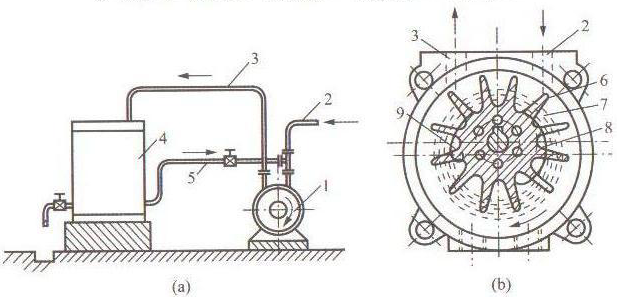 1-真空泵;2-抽氣管;3-排氣管;4-水氣分離箱;5-循環(huán)水管;6-葉輪;7-水環(huán);8-進氣孔;9-排氣孔